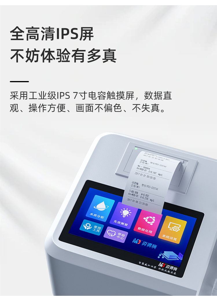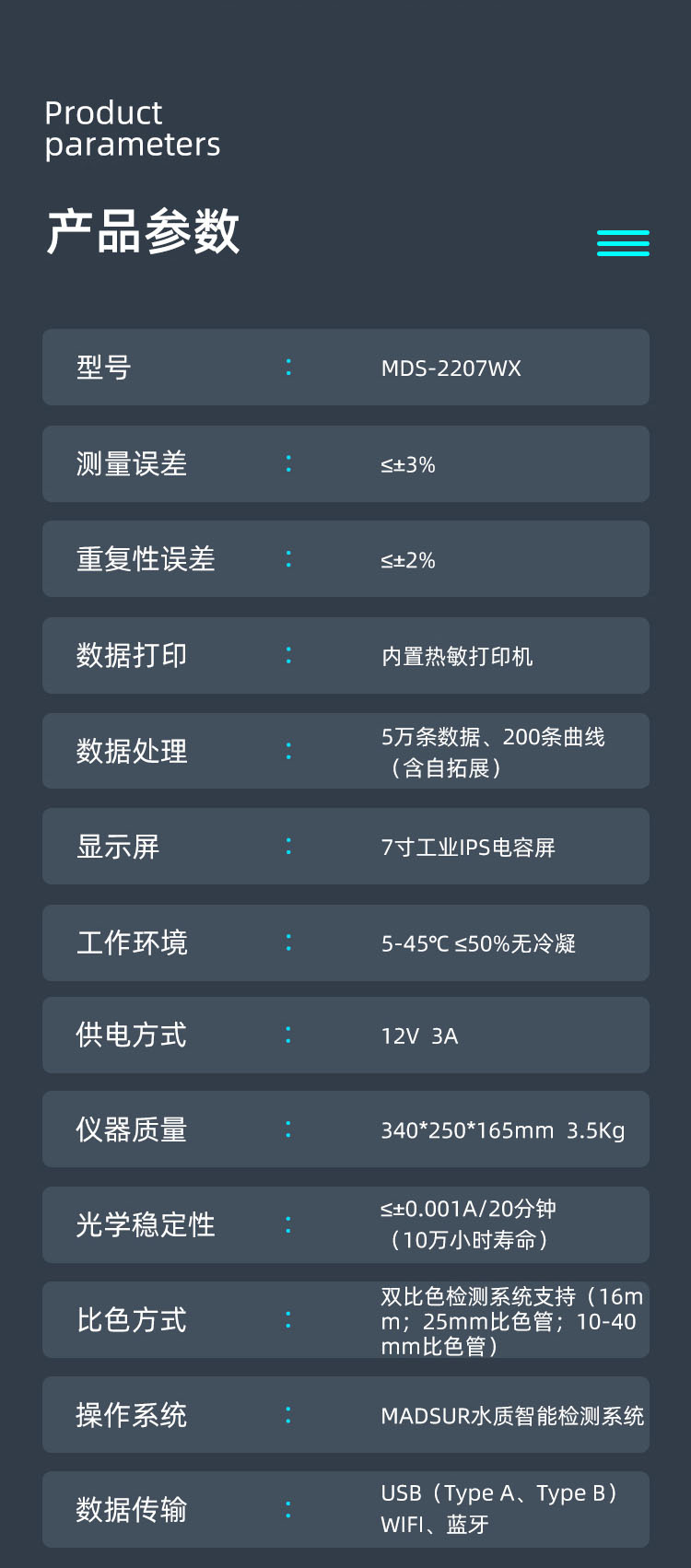 MDS -2207WX 型多參數水質快速測定儀,基于國家檢測標準(GB)及環境部檢測標準(HJ)研發生產。儀器采用工業級IPS7寸電容觸摸屏,數據直觀,操作方便;檢測裝置采用進口光學檢測比色系統,并搭載我司自主研發 MADSUR?水質智能檢測系統;使得儀器的穩定性、壽命、檢測精準度跨越性提高;MADSUR?水質智能檢測系統是基于國人操作習慣的理念開發而成,操作簡單快速;無 需專業人員即可輕松操作;真正做到:讓檢測更簡單!廣泛應用于企業污水檢測、環境監測站、科研單位、高校、河流污染監察等水質快檢領域。